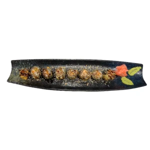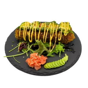 macrou afumat 75g (alergen: pește – D), stavrid marinat 75g (alergen: pește – D), rapane marinate în ulei picant 75g (alergen: moluște – F), pastă hummus 75g (năut 40g, pastă susan – tahini 30g – alergen: susan – H, ulei de floarea-soarelui 16g, bicarbonat de sodiu 8g, sare de lămâie 16g, sare 16g, usturoi 2g), ceapă roșie 80g, lipie 160g (alergen: gluten – A). Aditivi: E-536; E-500; E-330. Alergeni: pește – D, moluște – F, susan – H, gluten – A. Declarație nutrițională per 100g: energie 1109 kJ / 266 kcal, grăsimi 16,8 g, acizi grași saturați 4,8 g, glucide 12,6 g, zaharuri 1,5 g, proteine 10,8 g, sare 1,38 g.